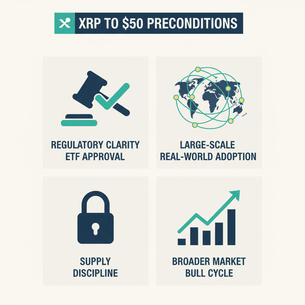This section outlines a plausible scenario framework for how XRP might climb toward a US $50 price target. It is not a prediction of certainty, but rather a structured path of what would need to align for such a move.