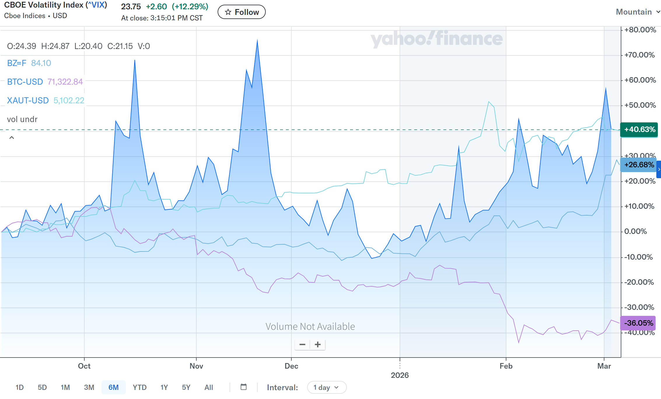 The chart below illustrates the six-month trend compiled by Yahoo Finance. The blue shaded area represents the CBOE Volatility Index (VIX), while the performance of Brent crude oil futures, gold, and Bitcoin is overlaid for comparison. As geopolitical risks escalated in 2026, the VIX rose significantly. On March 6, 2026, it closed at 23.75, while Brent crude oil rebounded strongly. Gold, as a safe-haven asset, recorded a notable increase, while Bitcoin experienced a sharp pullback.