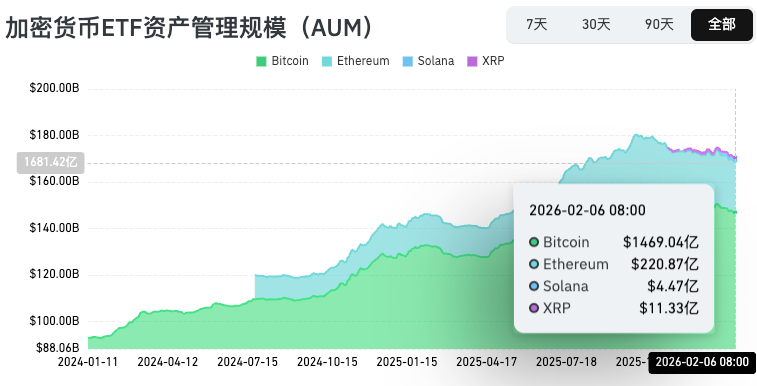 According to statistics, from February 3 to February 9, U.S. Bitcoin spot ETFs recorded a net outflow of $358 million. As of February 6, GBTC (Grayscale) had a cumulative outflow of $25.832 billion and held $11.17 billion in assets, while IBIT (BlackRock) held $53.511 billion. The total market capitalization of U.S. Bitcoin spot ETFs stands at $92.399 billion.
