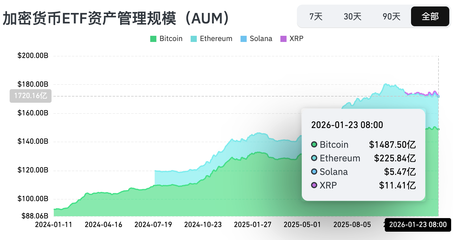 According to market data, US Bitcoin spot ETFs recorded net outflows of $1.32 billion between January 19 and January 24. As of January 24, GBTC (Grayscale) has accumulated total net outflows of $25.539 billion and currently holds $14.414 billion in assets, while IBIT (BlackRock) holds $69.721 billion. The total market capitalization of US Bitcoin spot ETFs stands at $120.315 billion.