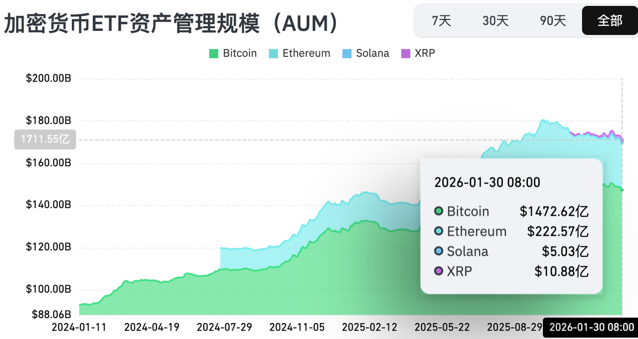From January 26 to January 30, US Bitcoin spot ETFs recorded net outflows of $1.487 billion. As of January 30, GBTC has recorded cumulative outflows of $25.658 billion and currently holds $13.366 billion in assets, while IBIT holds $65.095 billion. Total U.S. Bitcoin spot ETF market capitalization is $111.691 billion.