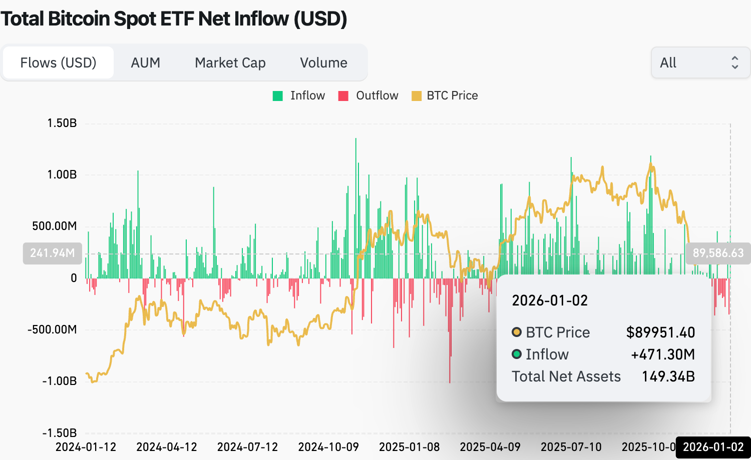 From December 29 to January 2, US Bitcoin spot ETFs recorded net inflows of USD 458.7 million. As of January 2, GBTC’s cumulative outflows reached USD 25.193 billion, with assets under management at USD 14.793 billion, while IBIT holds USD 69.313 billion. Total US Bitcoin spot ETF market capitalization stands at USD 119.546 billion.