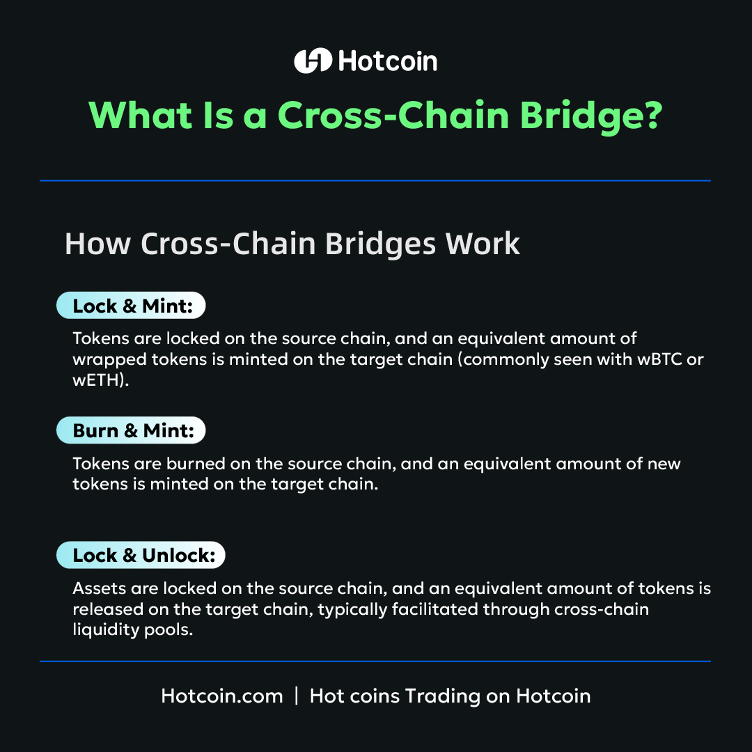• Lock & Mint: Tokens are locked on the source chain, and an equivalent amount of wrapped tokens is minted on the target chain (commonly seen with wBTC or wETH).