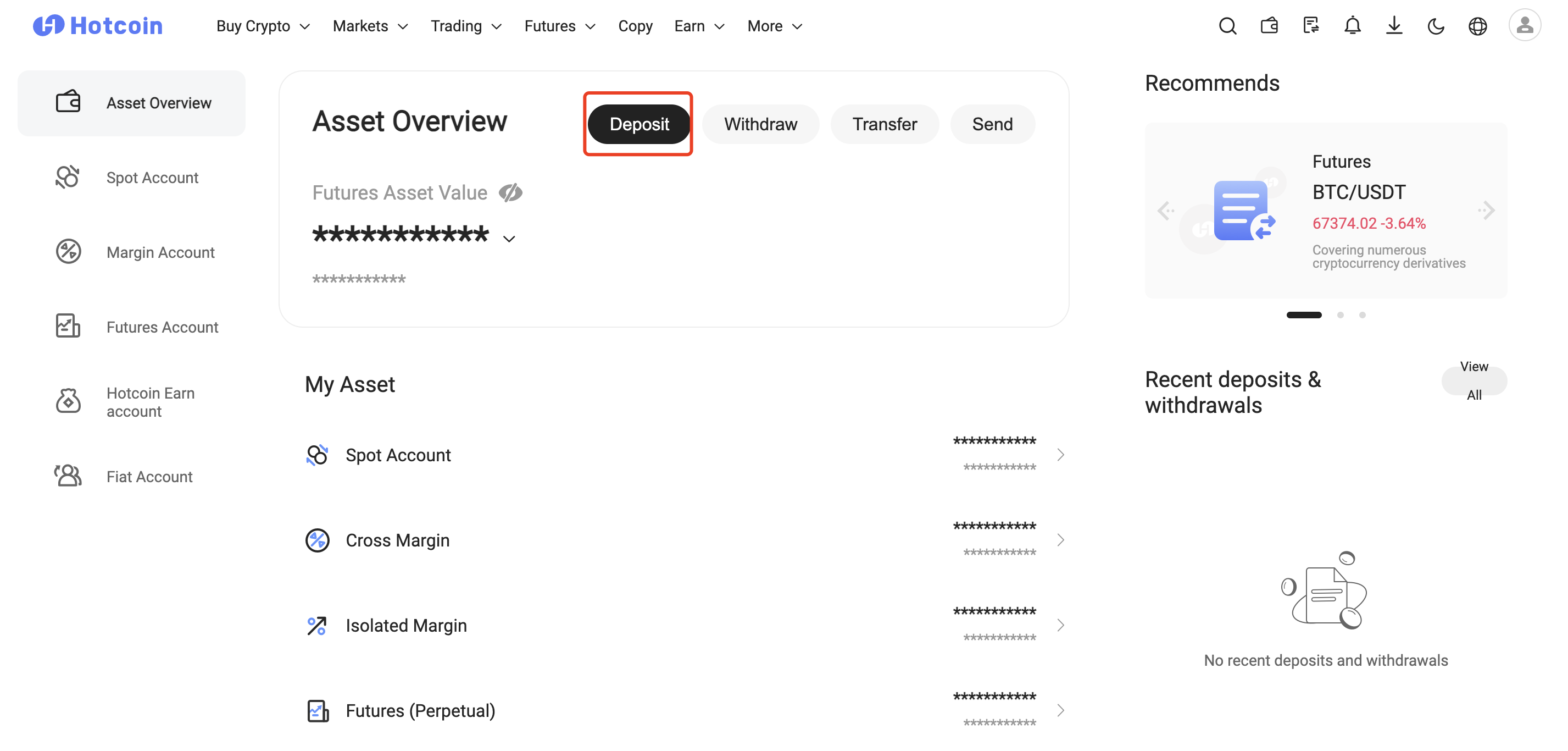 Send cryptocurrencies from your other wallet to your Hotcoin spot account. Or use fiat currency to buy cryptocurrencies through C2C currency buying/credit card buying.