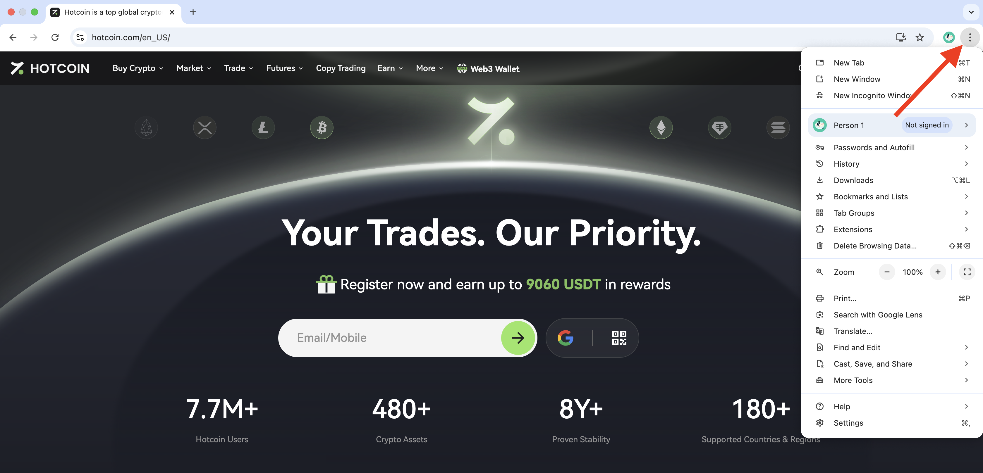 1. Open the Chrome browser and visit the Hotcoin webpage you want to add (e.g., https://www.hotcoin.com).