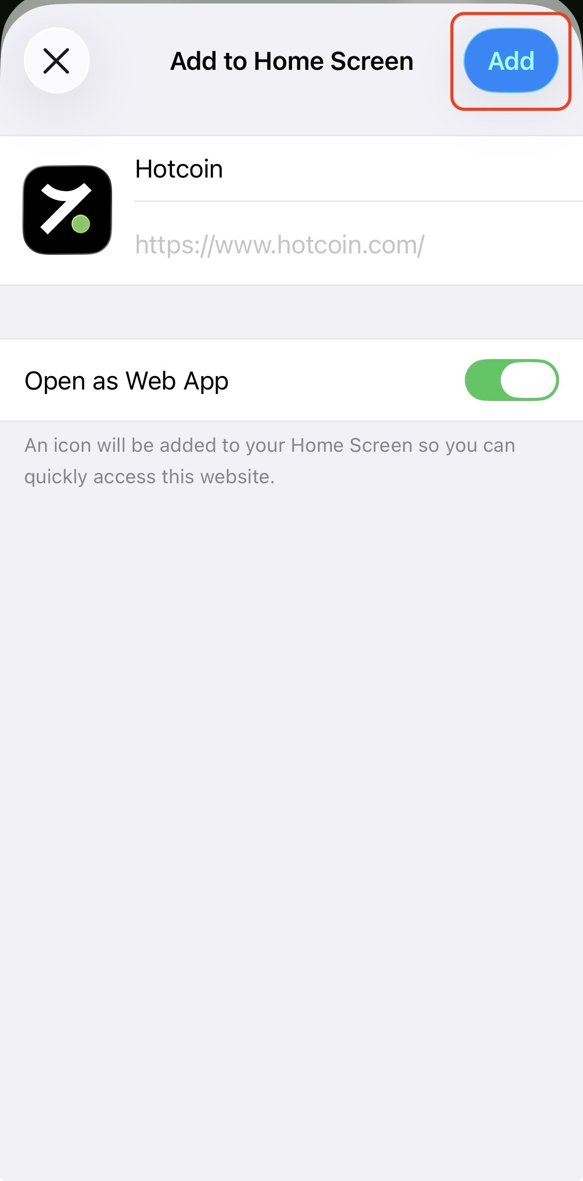 4. Edit the shortcut name (recommended: “Hotcoin”) and tap “Add” in the upper-right corner.