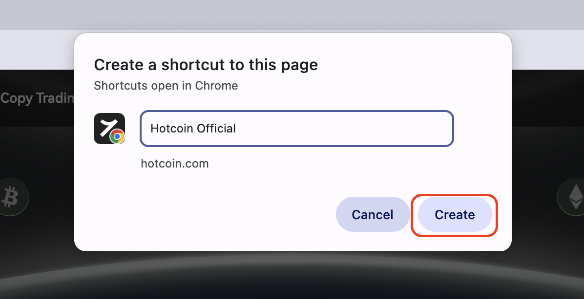 4. In the pop-up, you can customize the shortcut name, such as “Hotcoin Official”, and click "Create".