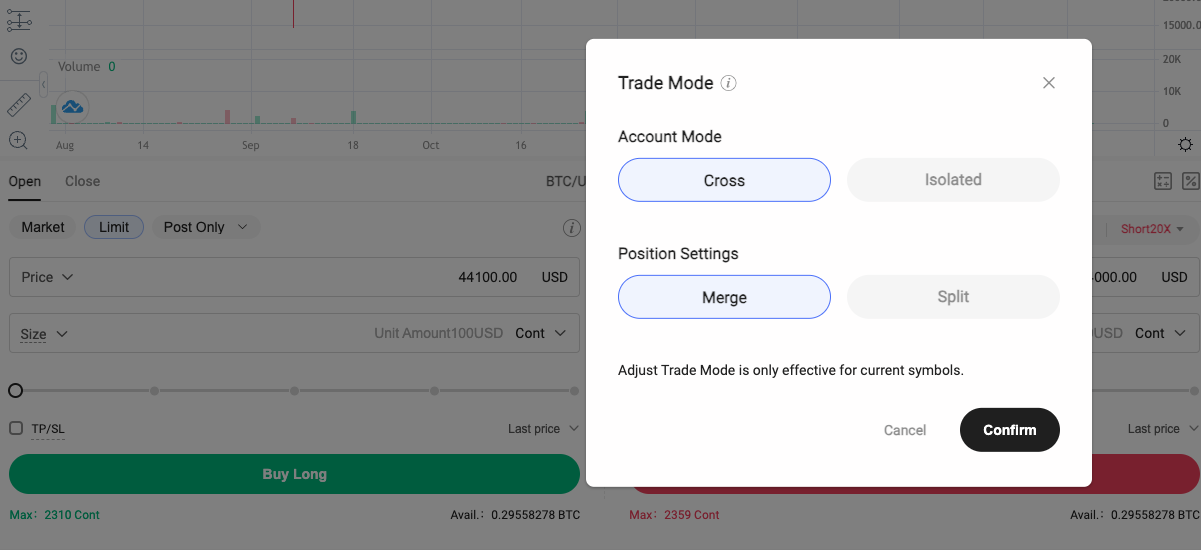 Step 2: Select the trading mode "Full Margin" or "Isolated Margin", "Close Margin" or "Split Margin"
