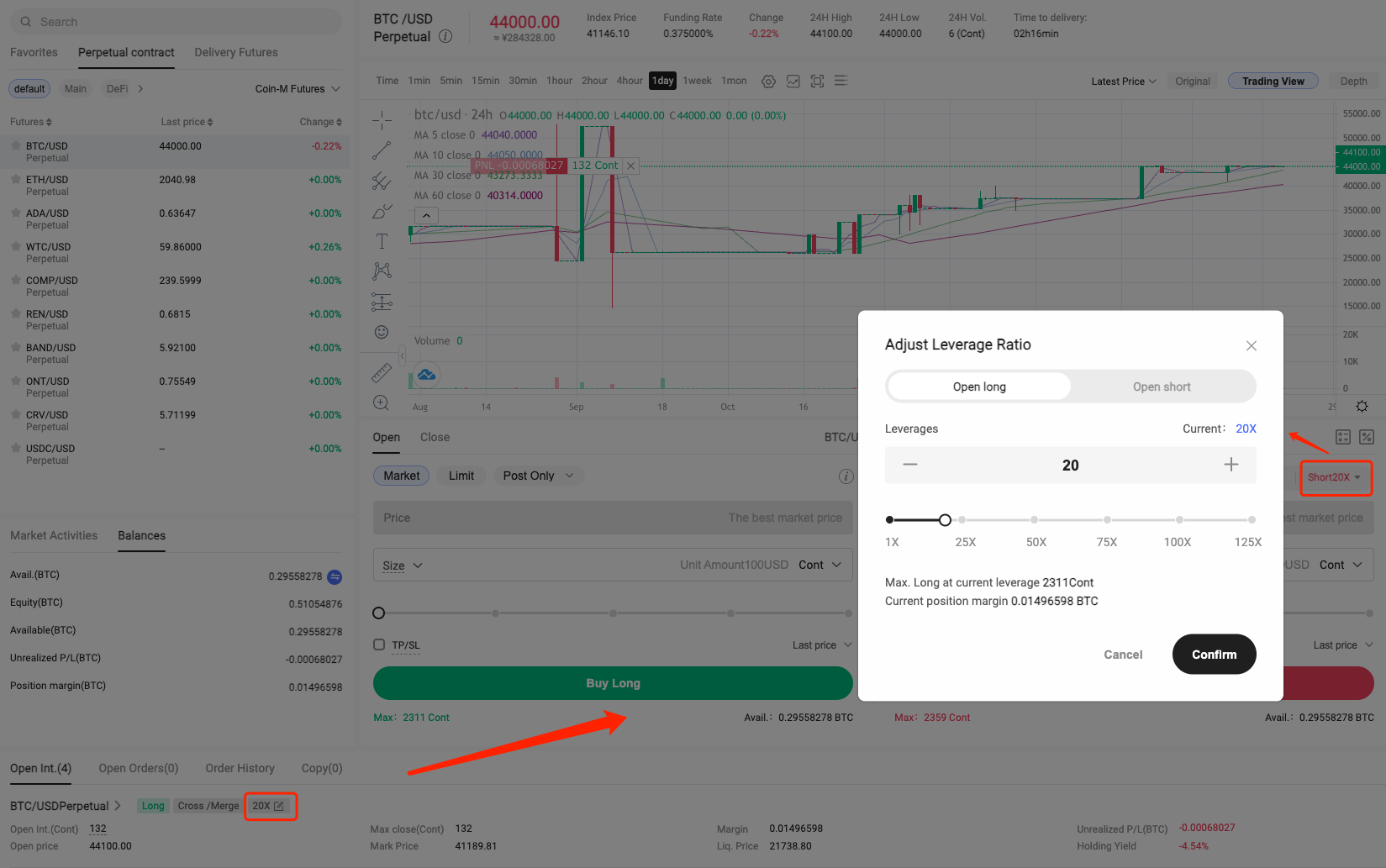 You can set the desired leverage ratio before opening a position, or modify the leverage ratio while holding a position. For example: the current long position is 20X. In order to reduce the risk of long and short hedging, it is planned to adjust the long position from 20X to 10X. Click the [20X] button, then manually adjust it to 10X, and finally click [OK] to adjust the long position. The single leverage multiplier becomes 10X.