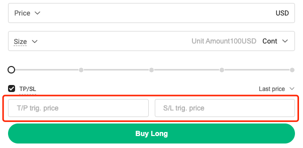 The Hoitcoin contract supports setting [Take Profit] and [Stop Loss] at the same time. For example, when the BTC/USD contract opens long at the price of $26069, you can set the trigger prices of take-profit and stop-loss at the same time.