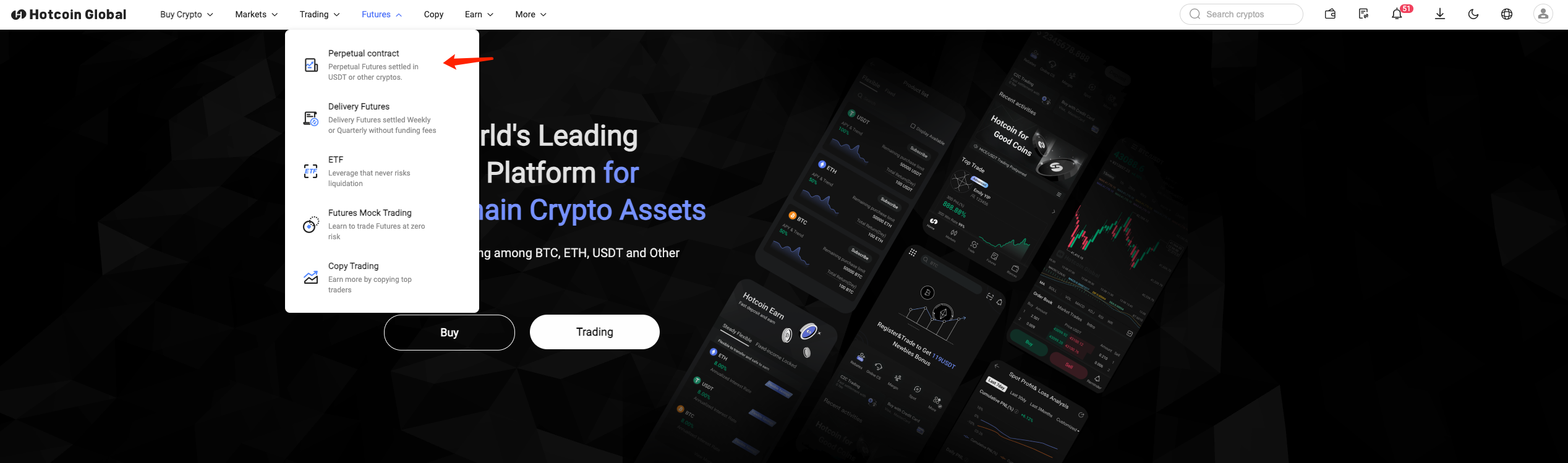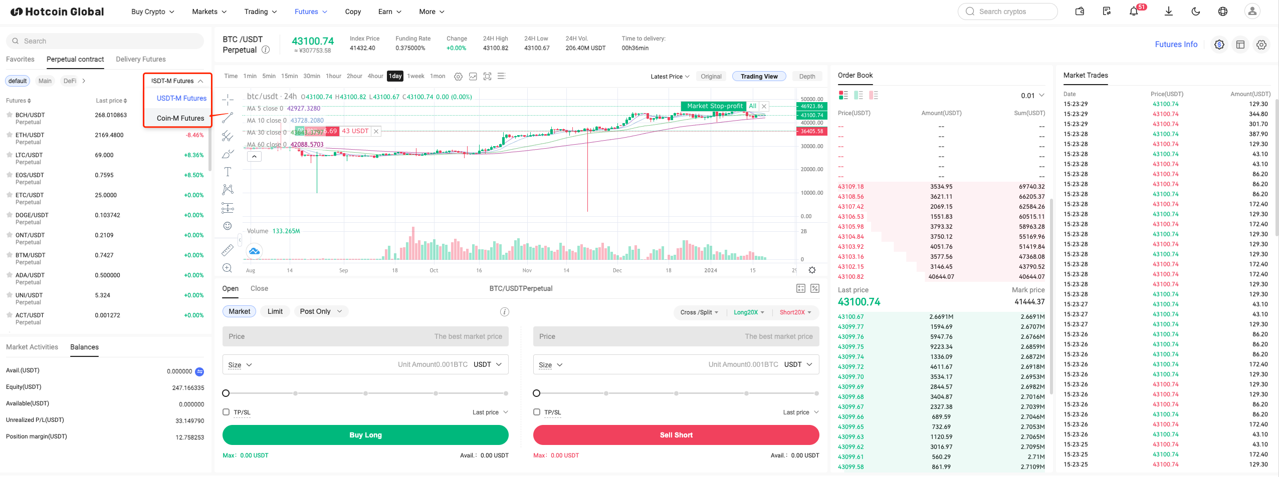 Hotcoin App and open the App. After successful login, click [Contract] and select [Perpetual Contract], after entering, switch the default USDT contract to the currency-based contract on the left.