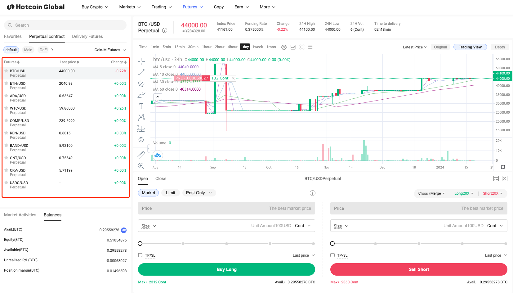 In the trading pair selection area on the left, select the contract trading pair you wish to go long or short, such as BTC/USD perpetual.