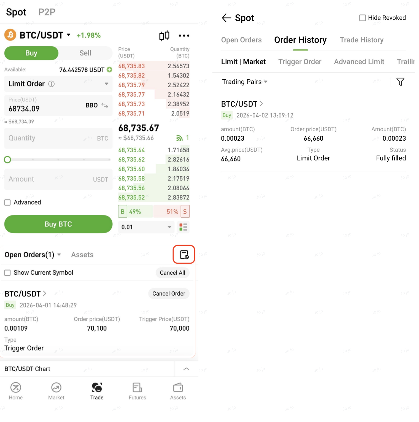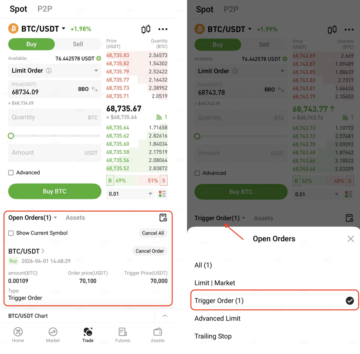 A trigger order is an order type that allows users to preset a trigger price, order price, and quantity. When the latest market price reaches the specified condition, the system will automatically place an order based on the predefined parameters.