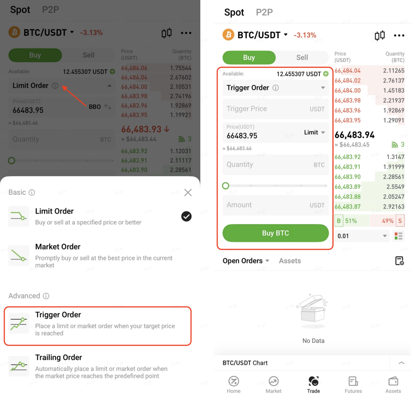 On the trading page, select Trigger Order, set the trigger price, order price, and quantity, then click Buy or Sell to place the order.