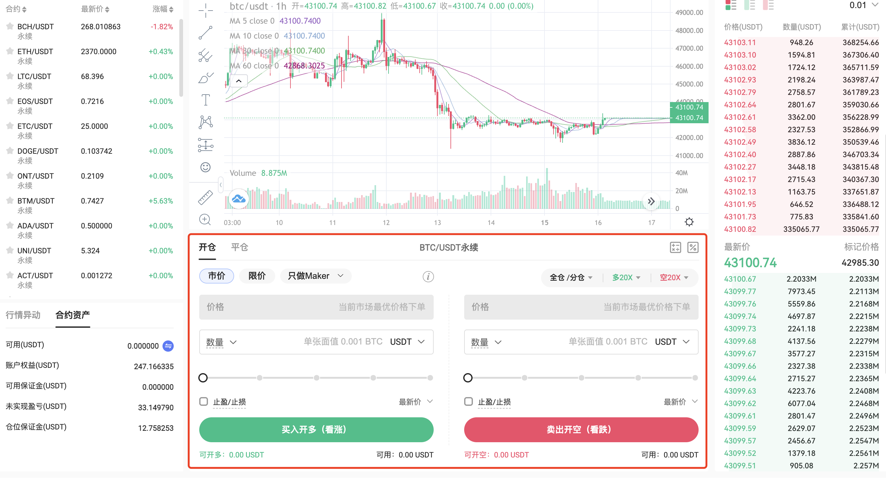 USDT本位合约是以USDT作为报价和结算的合约产品。Hotcoin 支持超过 50 种U本位合约交易对,杠杆最大可达 125 倍。在合约交易中,您可以通过做多或做空某个合约交易对,参与到市场价格波动中并从中获取收益。
