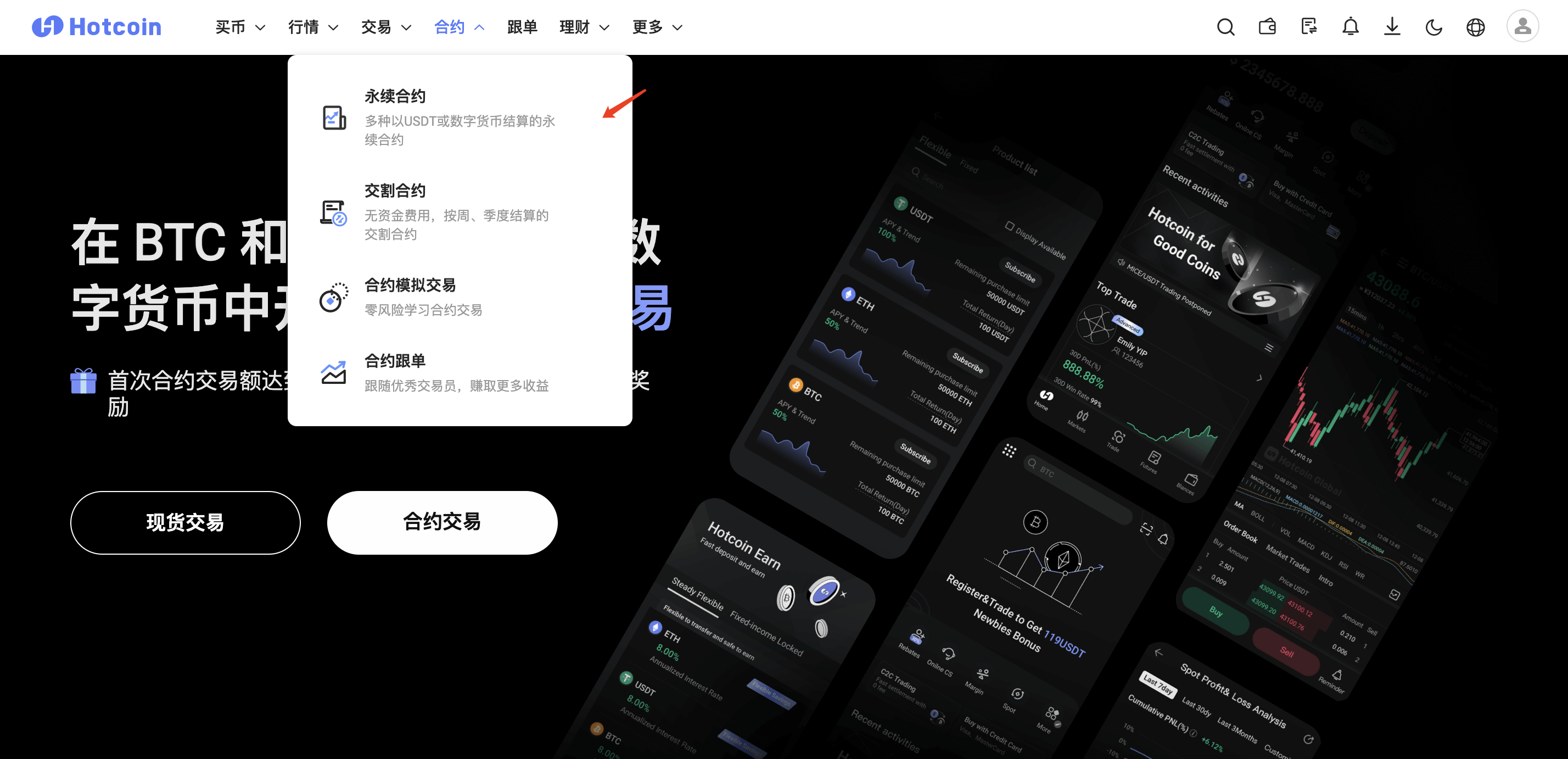 Hotcoin App后打开App,登录成功后点击【合约】并选择【永续合约】即进入U本位合约实盘交易页面。