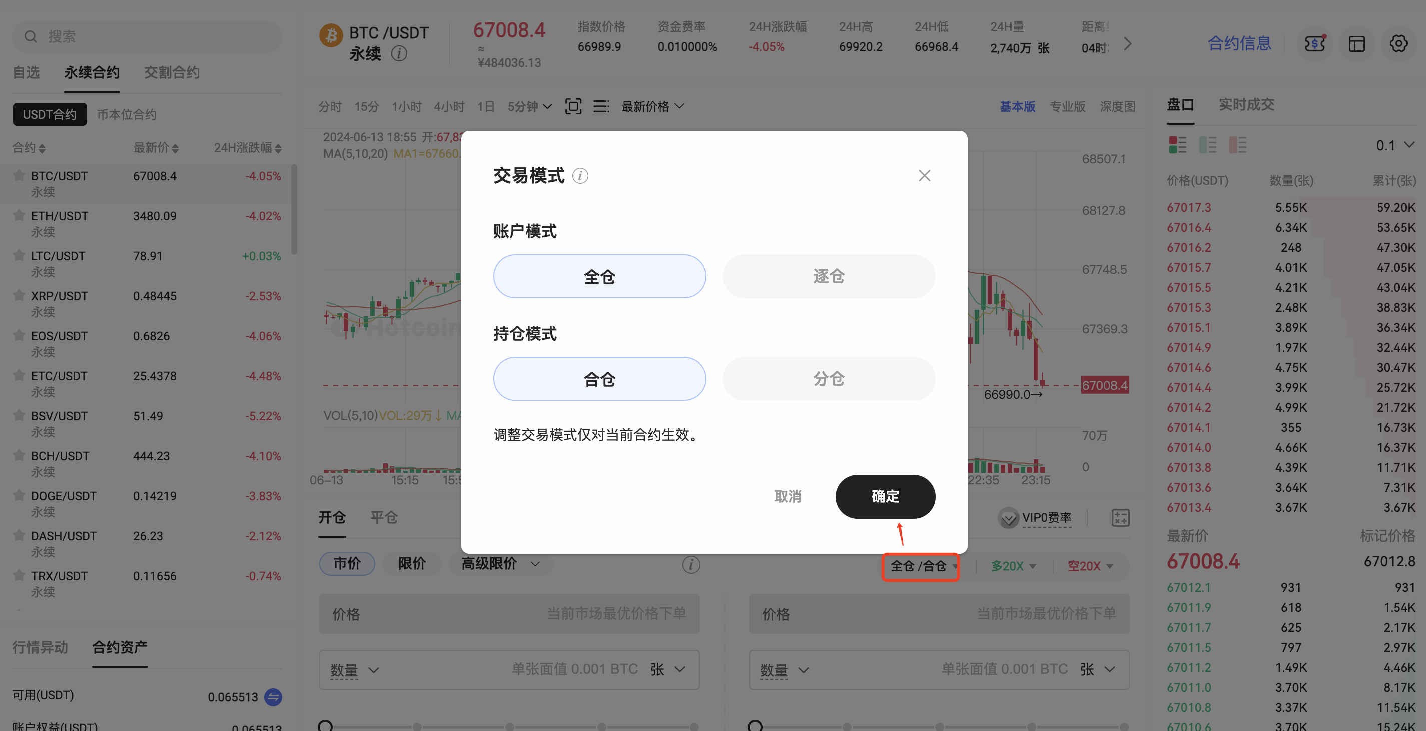 步骤二:选择交易模式「全仓」或「逐仓」,「合仓」或「分仓」