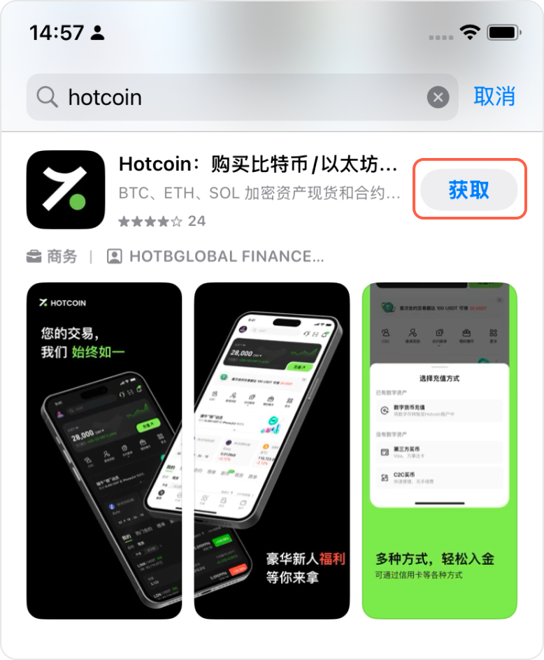 1、登录成功后,会自动跳转至ID对应地区的App Store,搜索出“Hotcoin”,点击【获取】即自动下载。