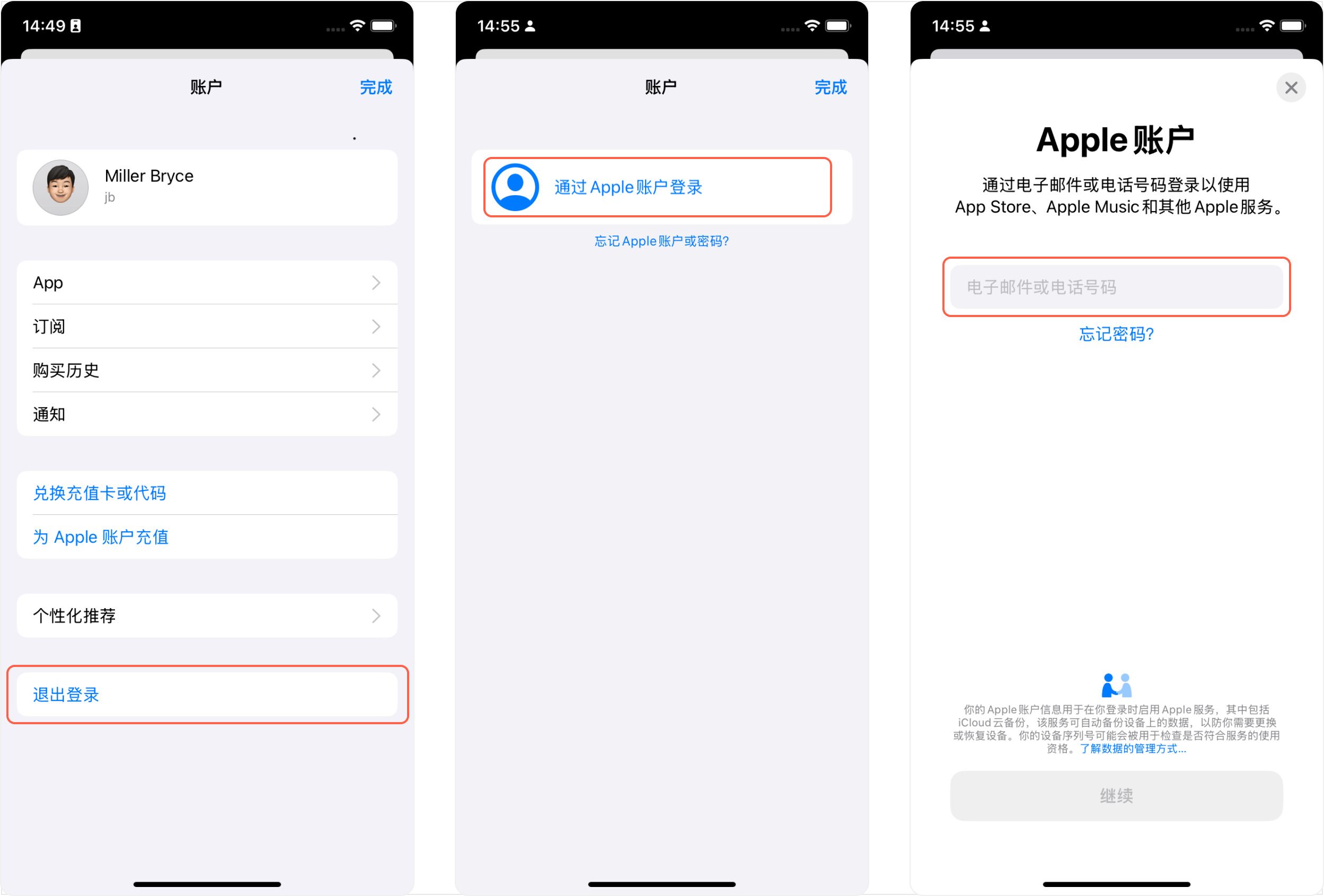 2、拖到最下方,点击退出登录,输入非大陆地区的Apple ID和密码重新登录