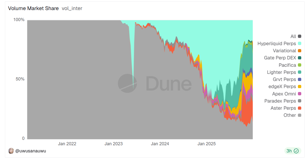 2025年12月30日 Lighter 的 TGE 將Perp DEX賽道再次推向聚光燈下,也為2025年鏈上永續合約的競逐畫上了句點:年初Hyperliquid 一家獨大,佔據超七成市場份額;下半年隨著 Aster、Lighter、EdgeX等各具特色的新晉 Perp DEX 崛起,Hyperliquid 市占率降至兩成左右,進入了技術、資本、激勵與真實需求全面博弈的新階段。