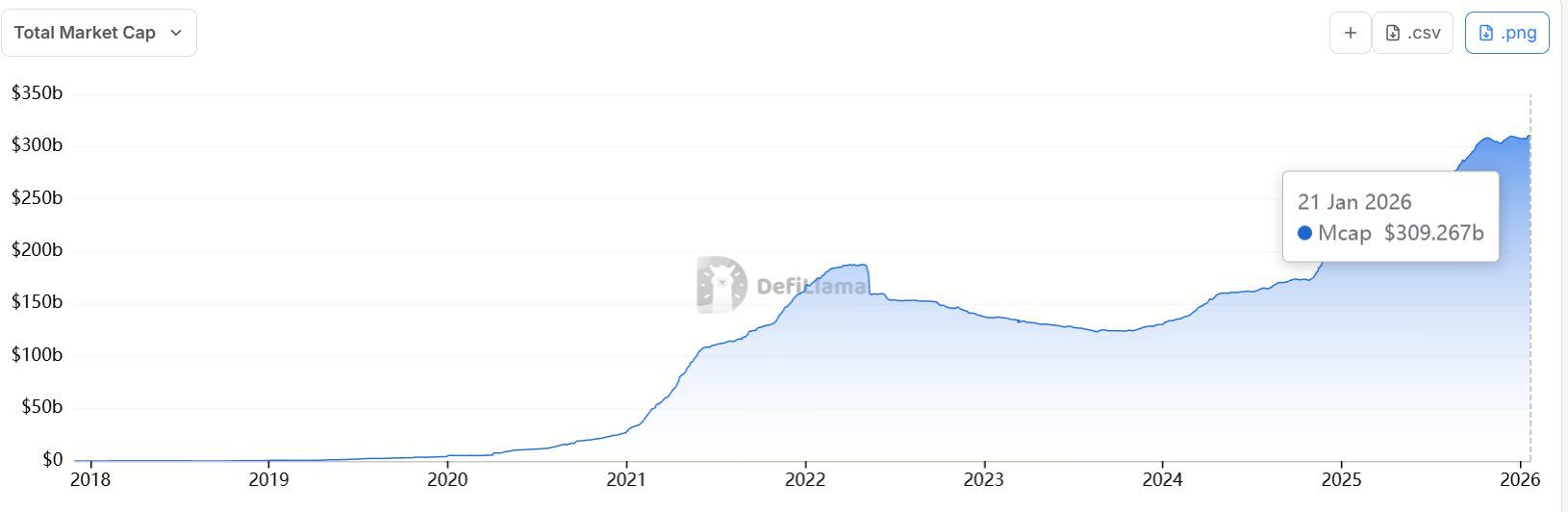 穩定幣與資金流動:穩定幣作爲加密市場的關鍵基礎設施,其發行與流通規模直接反映場內資金的“蓄水池”狀況,也受宏觀環境影響。牛市中,資金涌入推動穩定幣市值快速攀升,熊市則穩定幣需求下降、規模收縮。穩定幣供應的變化往往領先或同步反映資金進出市場的動態。例如,2020-2021年牛市中USDT、USDC等穩定幣供應從不足300億美元暴增至2021年底的約1500億美元以上;而2022年熊市中總市值略有回落,2023年初約在1300億美元附近企穩。進入2024-2025年新一輪行情,穩定幣市場再度擴張,目前全球穩定幣總市值已突破3000億美元,較一年前增長約75%。