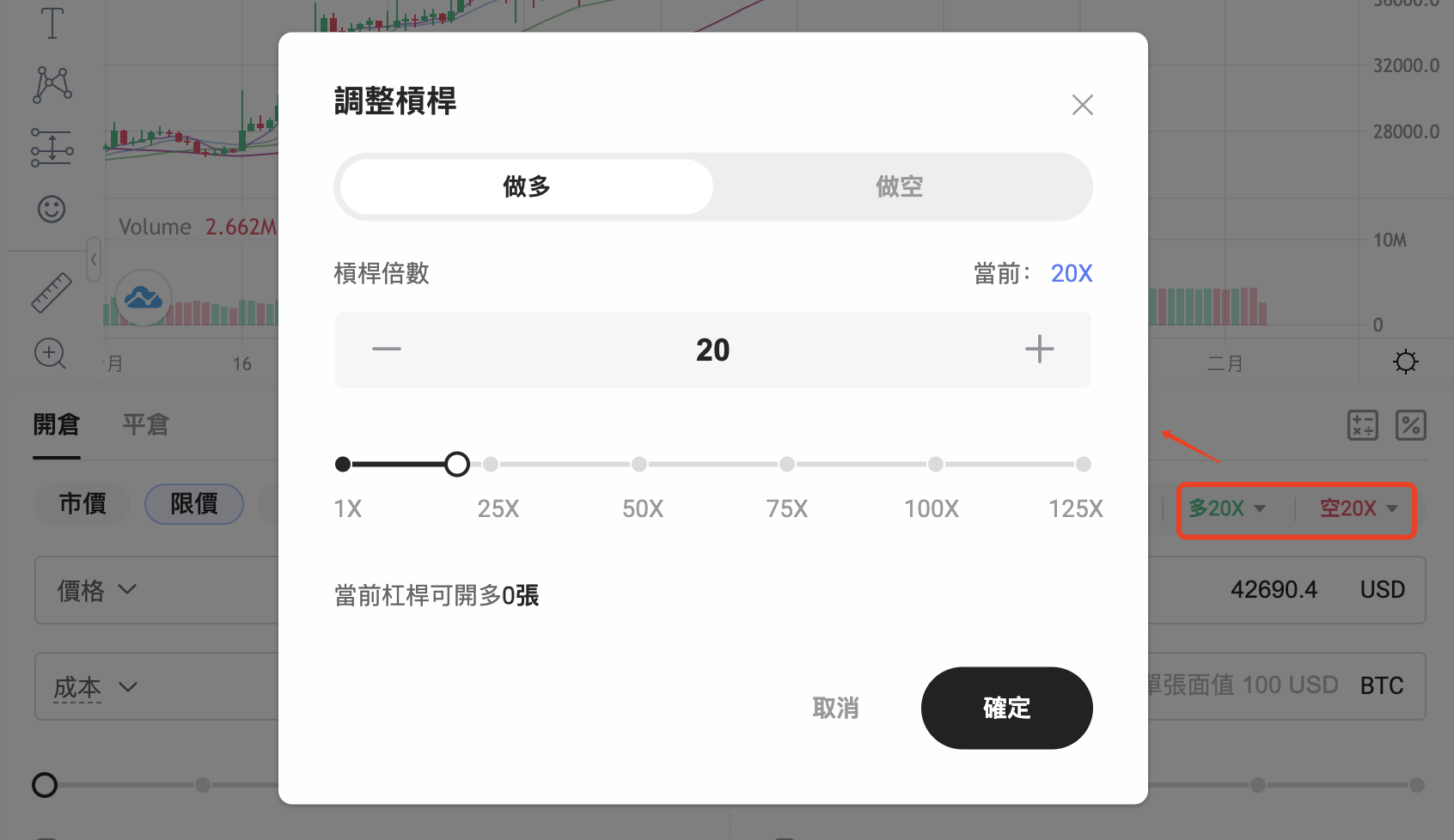 您可以在開倉前設定好期望的槓桿倍數,也可以在持倉時修改槓桿倍數。 例如:目前持倉的多單為20X,為降低風險多空對沖,計畫將多單由20X 調至10X,點選【20X】按鈕,再手動調整調成10X,最後點選【確定】即可調整後多 單槓桿倍數變成10X。