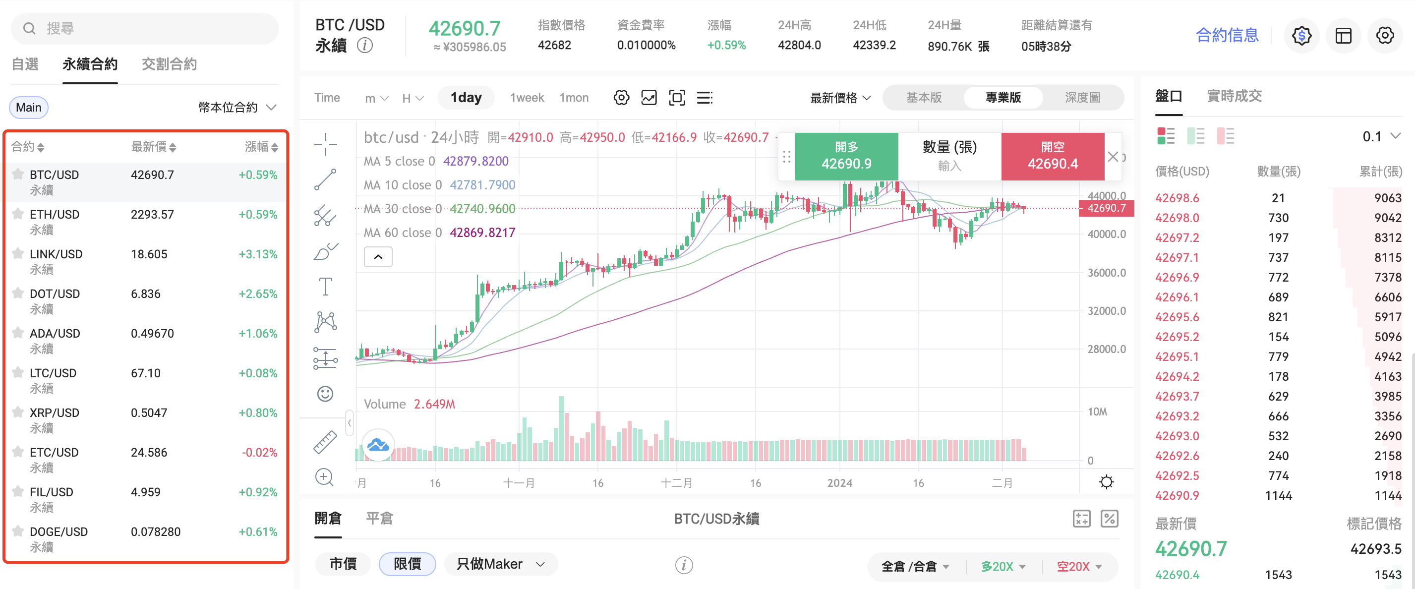 在左側交易對選擇區選擇您希望做多或做空的合約交易對,例如BTC/USD永續。