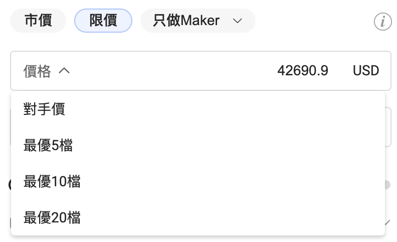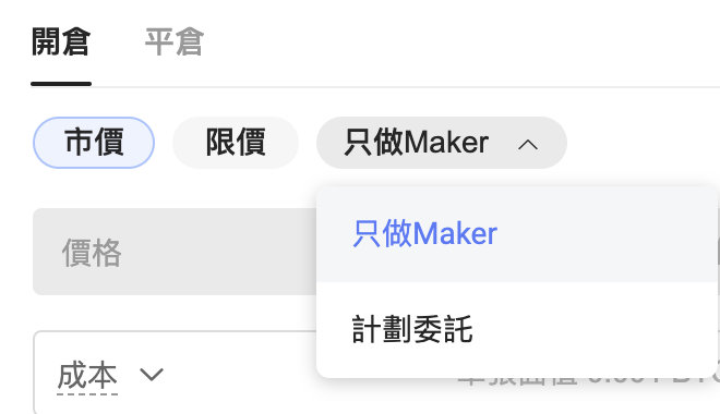 只做Maker:下單時您可以選擇只做Maker,這樣您的訂單將不會立即在市場中執行。 它將在訂單簿上以Maker 訂單的形式存在,但不會和已經在訂單簿上的訂單相符。 只做 Maker 訂單會為市場增加流動性。 以吃單方執行訂單時,您將只需支付Maker 費,不會支付Taker費用。