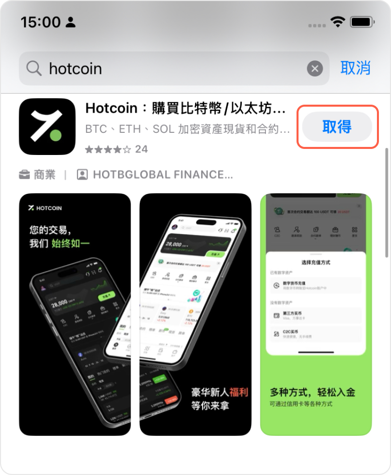 1、登錄成功後,會自動跳轉至ID對應地區的App Store,搜索出「Hotcoin」,點擊「取得」即自動下載。