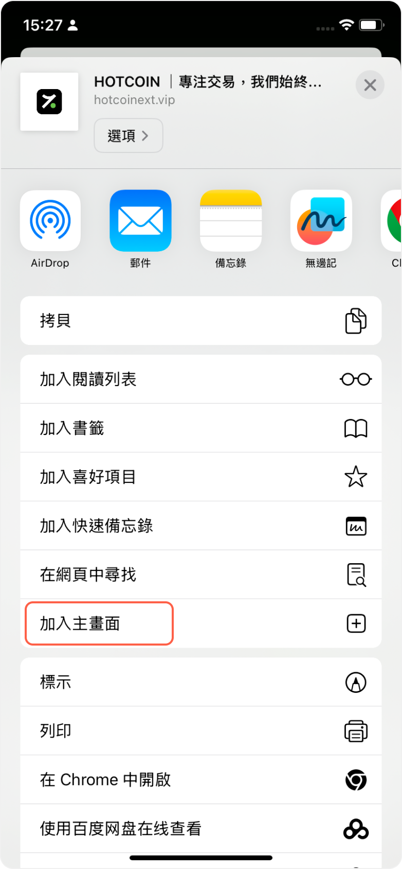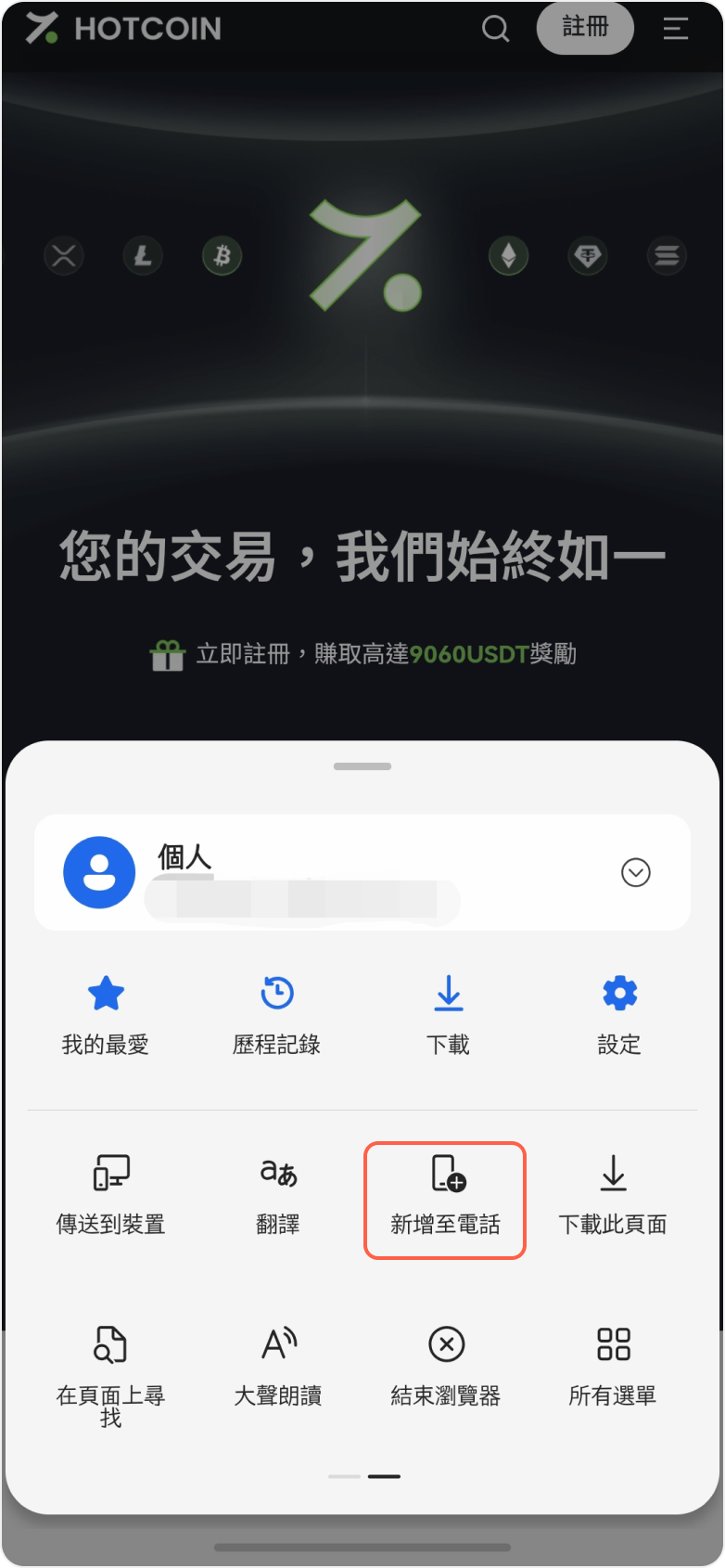 ● 若瀏覽器不支援「新增至主畫面」,可改用:收藏/書籤 功能,方便下次造訪 Hotcoin