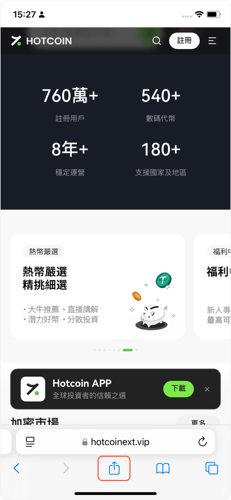 1. 開啟 Safari 瀏覽器,造訪您想要新增的Hotcoin網頁。