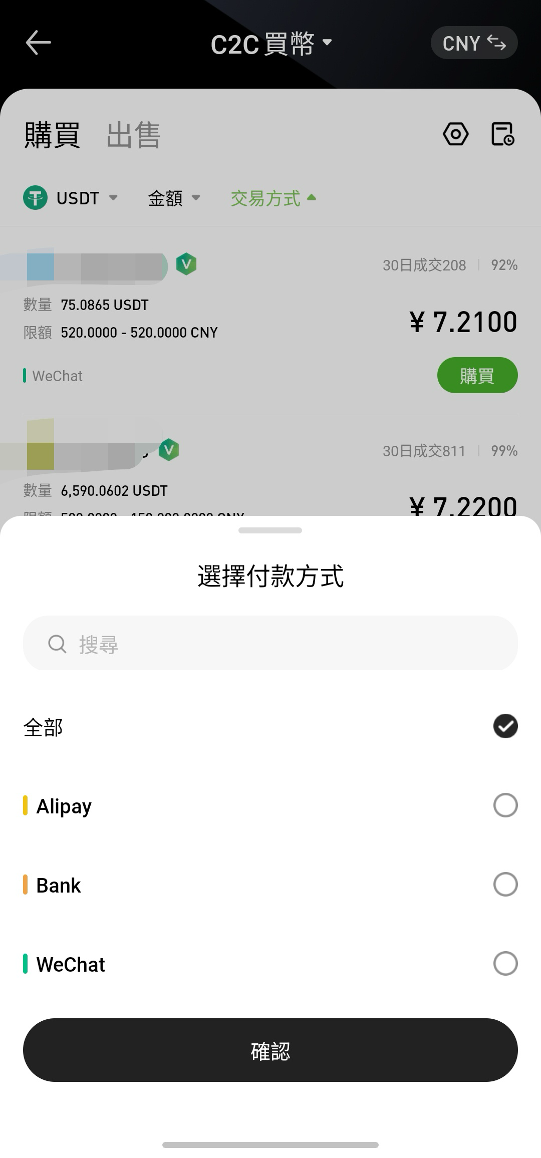 在 C2C 交易中,點擊「我已付款」並不會自動完成轉帳。您需要透過微信、銀行卡或支付寶等方式手動完成轉帳。