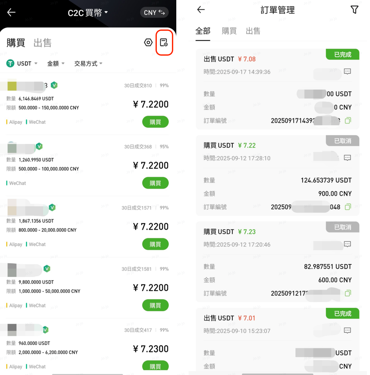 進入 C2C 交易頁面,點擊右上角 「訂單管理」圖示,即可查看訂單記錄。