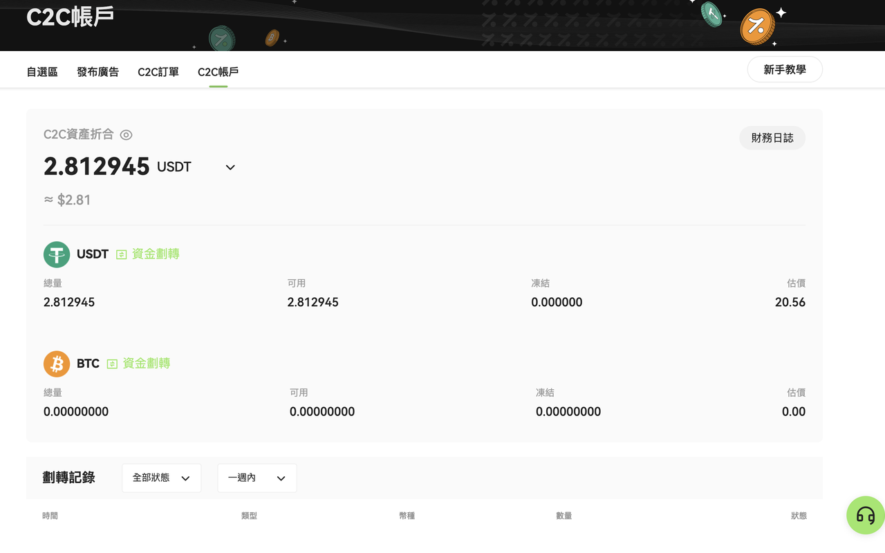 如需進行交易,您可以將 C2C帳戶中的資產劃轉至其他帳戶。更多詳情請參閱:《什麼是資金劃轉?》