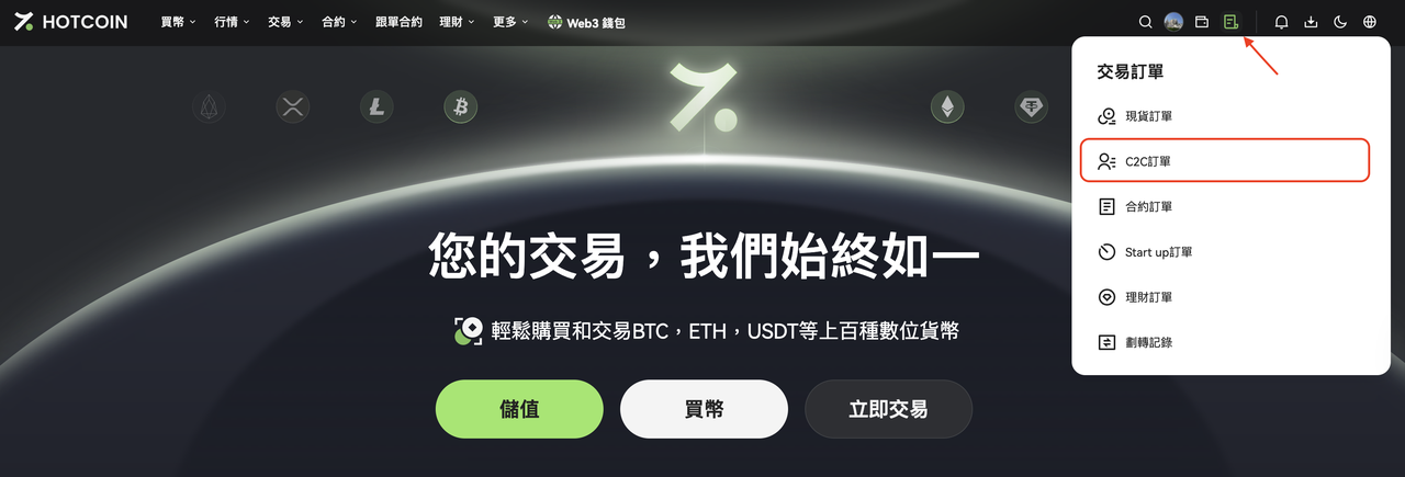 在 Hotcoin 官網右上角點擊 「交易訂單」,在下拉選單中選擇 「C2C訂單」;