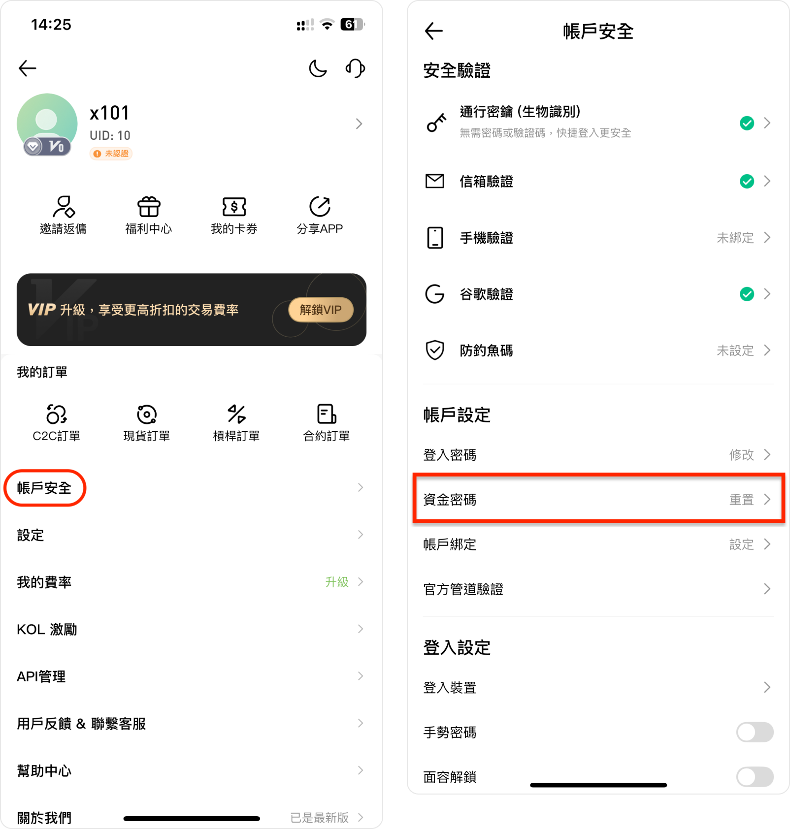 第二步:點選【帳戶安全】,找到【資金密碼】,點擊右側【設定】