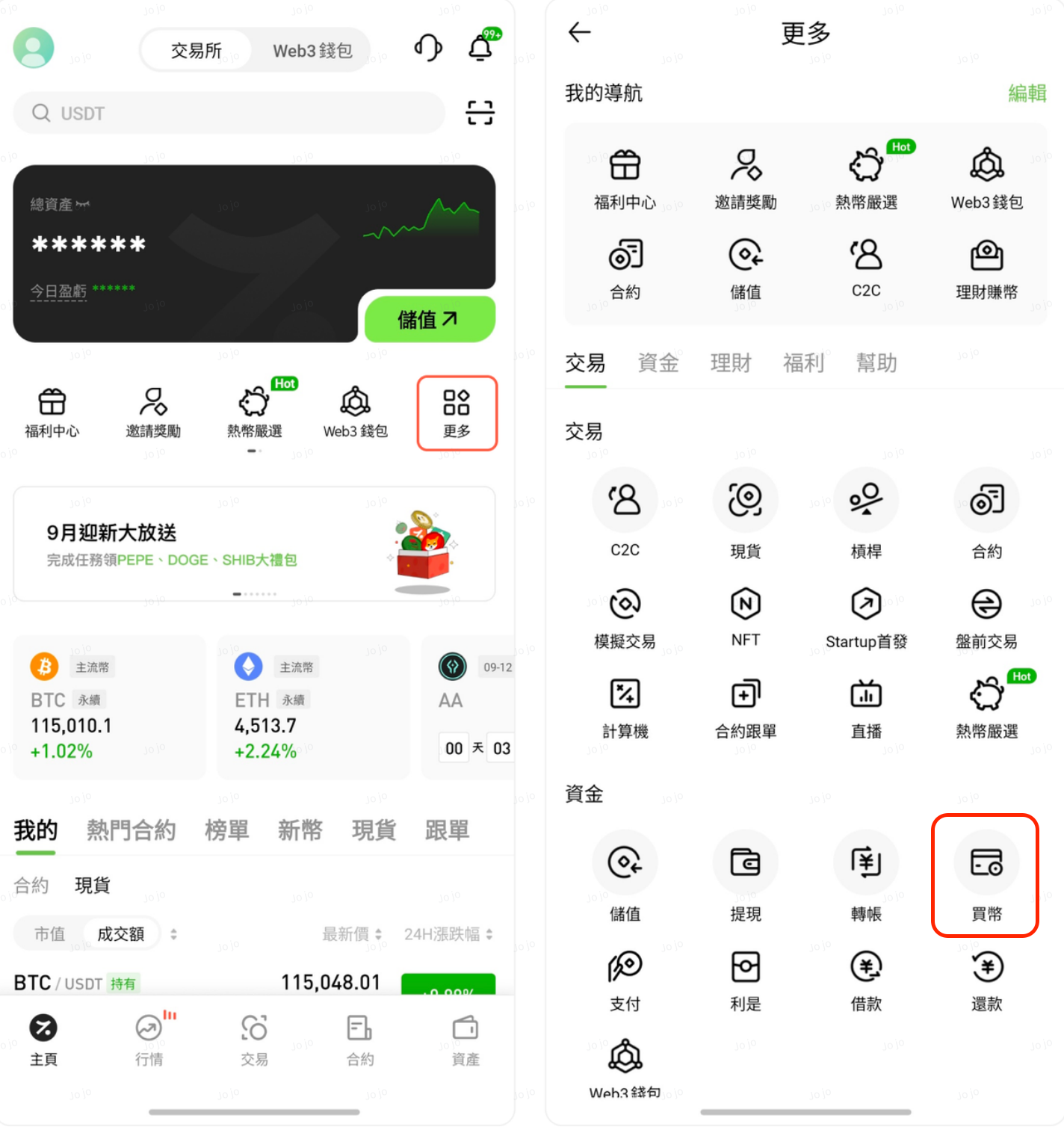 在首頁功能區,點擊「更多功能」,找到資金模組的「買幣」。