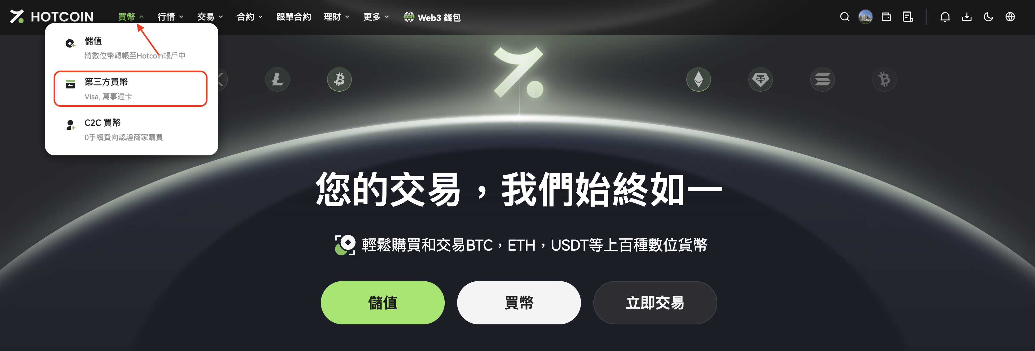 登入Hotcoin官網首頁,在頂部導覽列點選「買幣」-「第三方買幣」進入購買介面。