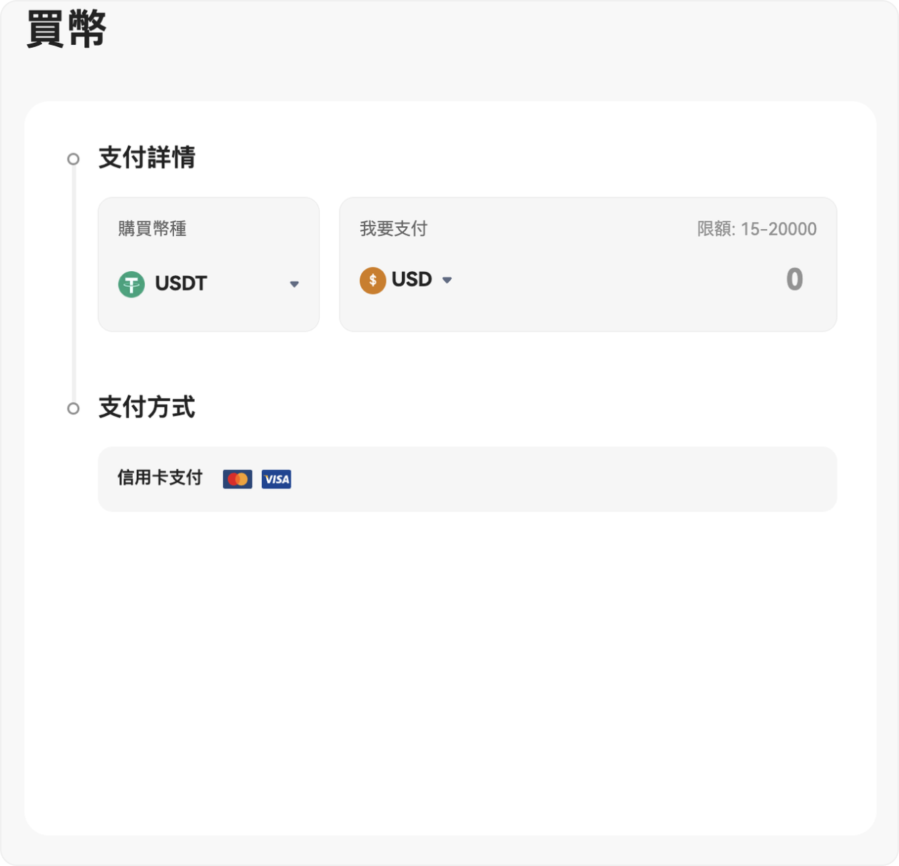 選擇您要購買的幣種,並輸入支付的法幣種類及金額。