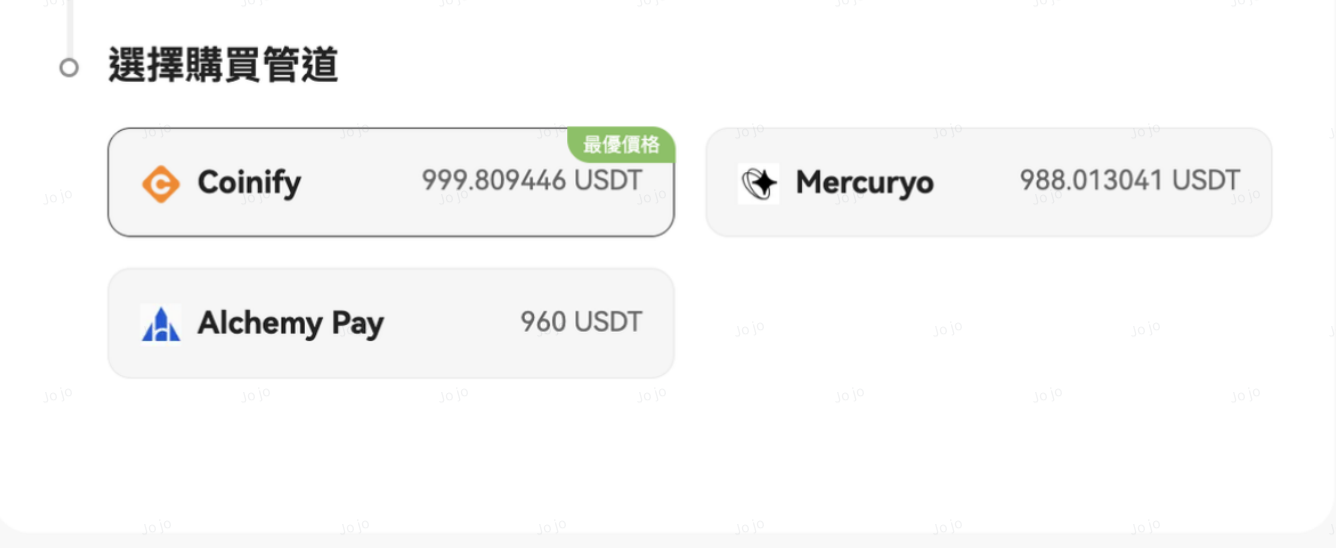 通過 Coinify、Simplex 和 Alchemy Pay,您可以使用多種支付方式便捷購買加密貨幣,無需繁瑣充值,即可快速開啟交易體驗。