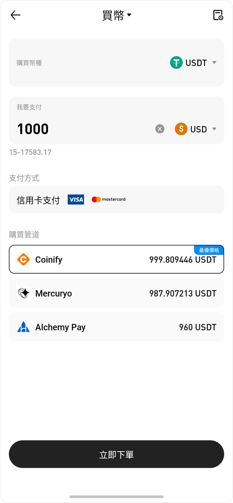 1. 在服務商列表中選擇 Coinify 並下單;