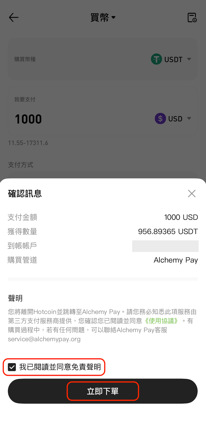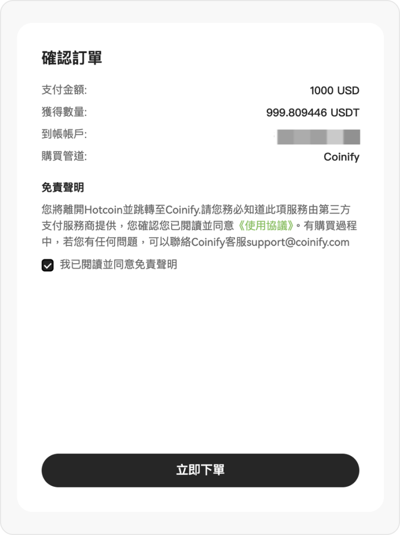 2. 在「確認訂單」中勾選免責聲明並點擊「立即下單」,系統將跳轉至 Coinify 頁面;