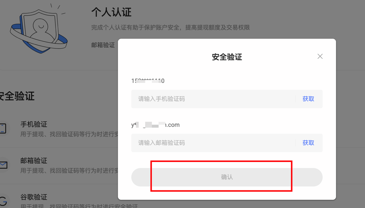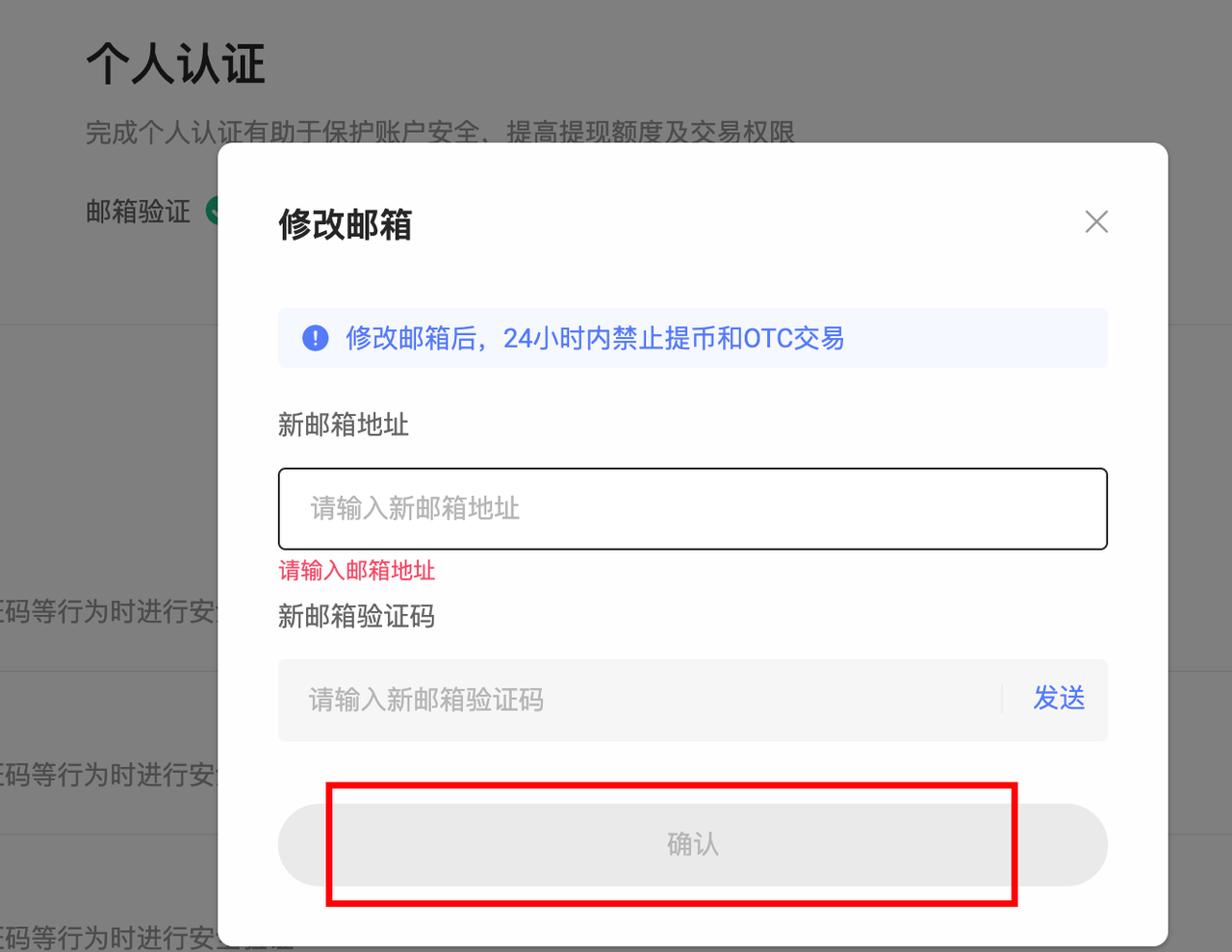 注意:修改邮箱后,24小时内禁止提币和OTC交易