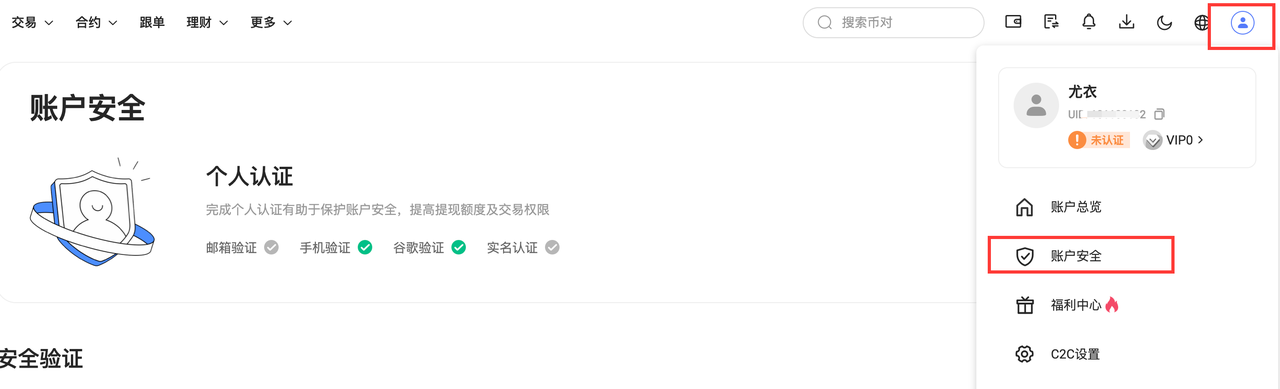 步骤1: 登录Hotcoin账号,点击“头像”—“账户安全”