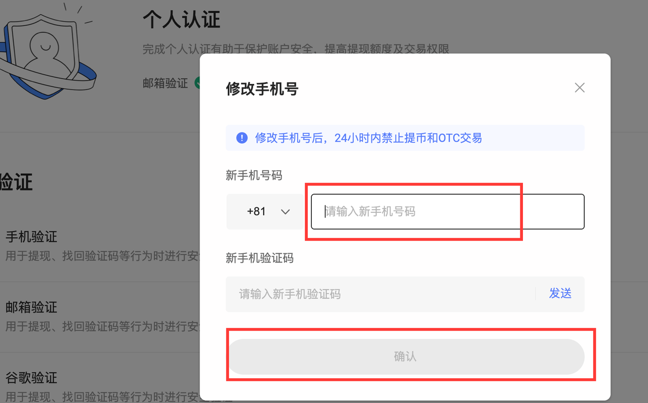 注意:修改手机号后,24小时内禁止提币和OTC交易