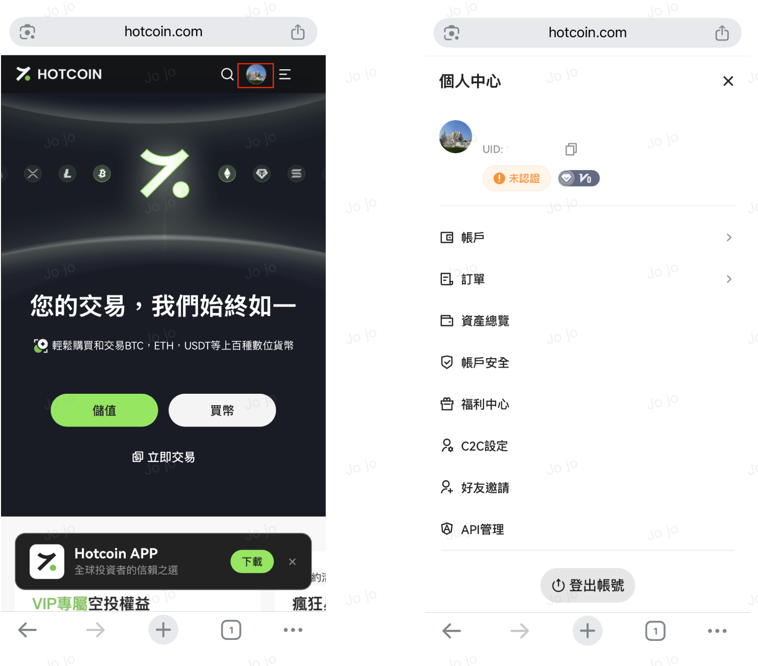- 驗證碼確認後,系統將自動跳轉至 Hotcoin 首頁並保持登入狀態,您可點擊頁面右上角的個人頭像進入「個人中心」進行相關設定;