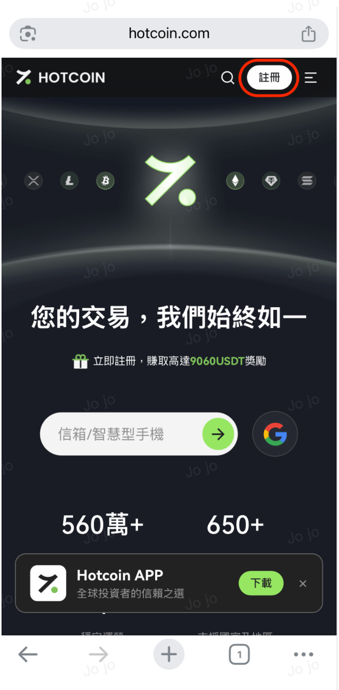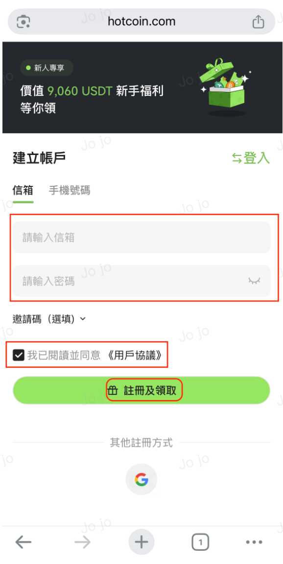 如您希望透過手機瀏覽器註冊 Hotcoin 帳號,可參考以下操作步驟: