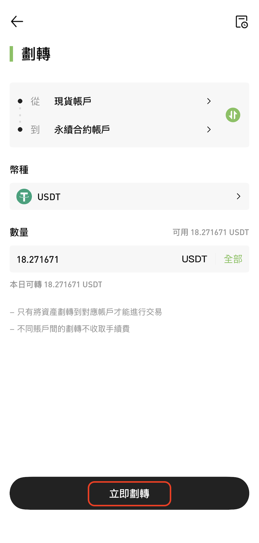 輸入劃轉數量後,點擊 「立即劃轉」,資金將即時到帳。