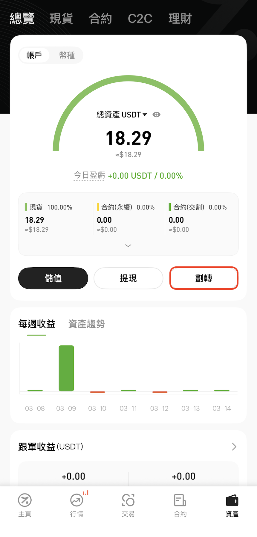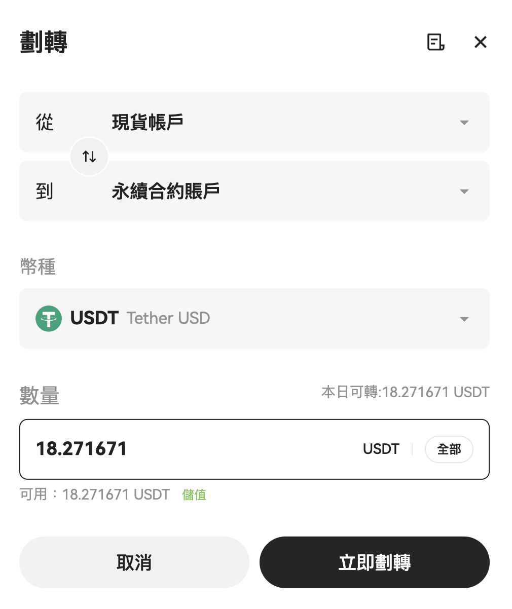 - 現貨帳戶 → 合約帳戶(用於合約交易)