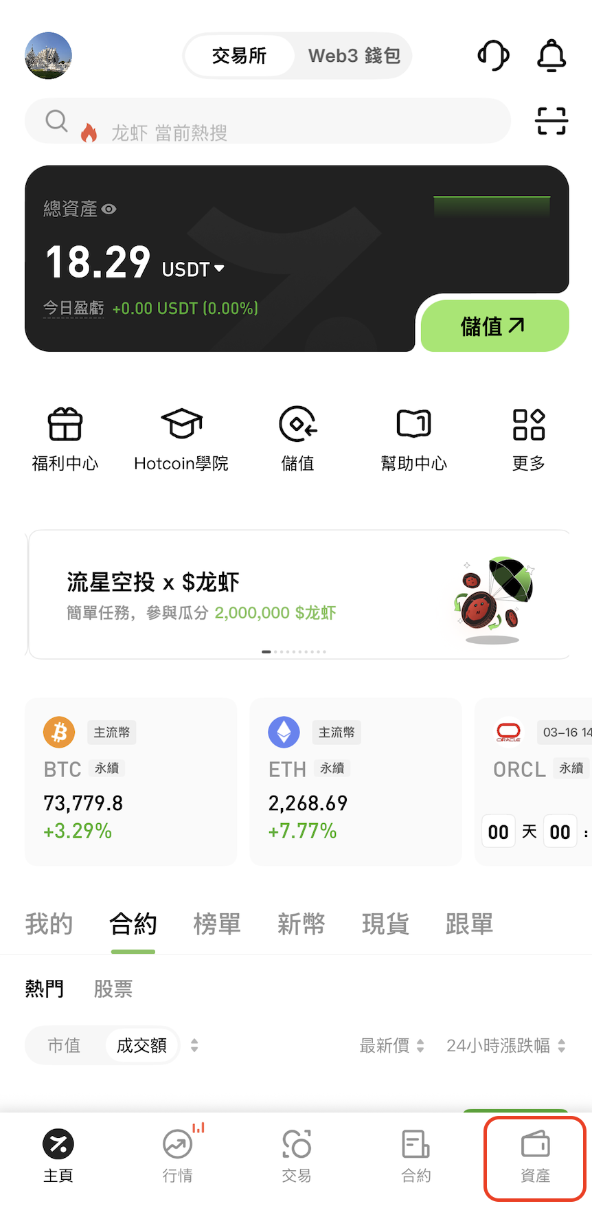 打開 Hotcoin App,點擊首頁右下角 「資產」,進入 「資產總覽」 頁面。